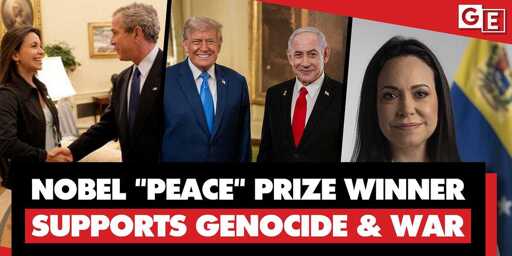Nobel Peace Prize laureate María Corina Machado is a far-right Venezuelan coup-plotter funded by the US government. She supports Israel as it commits genocide and is key to Trump's regime-change war.